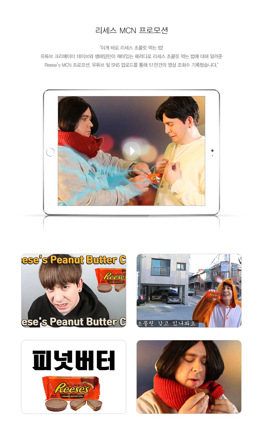 유튜브 크리에이터 데이브와 샘해밍턴이 재미있는 패러디로 리세스 초콜릿 먹는 법에 대해 알려준 Reese’s MCN 프로모션. 유튜브 및 SNS 업로드를 통해 51만건의 영상 조회수 기록했습니다.클라이언트