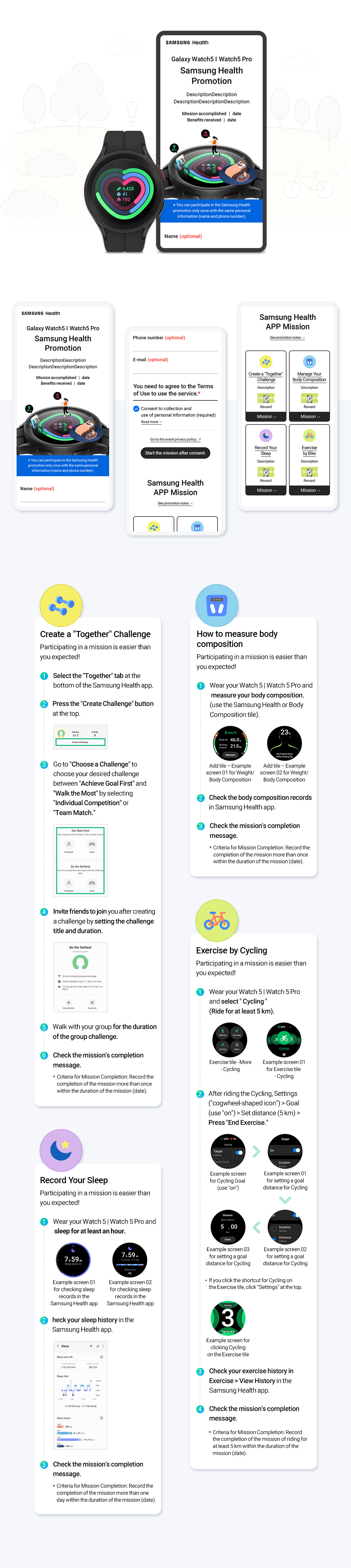 삼성 갤럭시 워치와 연동되어 자동으로 미션 진행 내역을 체크하고, 미션 별로 진행 내역에 따른 달성 보상을 바로 획득할 수 있도록 구현했습니다. 이 페이지는 다국어 적용이 가능하도록 심플한 디자인과 텍스트 기반 퍼블리싱으로 제작되었습니다. 동일 계열의 프로모션 진행시에 간편하게 추가 페이지를 제작할 수 있는 방식으로 구현된 프로모션 제작 사례 입니다.클라이언트
